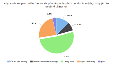 Protože dotázaní velmi často mluvili o problémech spojených s personálem, další otázka se vyloženě nabízela. Zajímalo nás, co jim naopak správné fungování této oblasti osobně přináší. Asi vás nepřekvapí, že mezi odpověďmi výrazně vystupuje čas a lepší chod firmy, ale zajímavé je, že nejvýraznější odpovědí byl dobrý pocit, pocit z toho, že se daří budovat a udržovat skvělý tým.