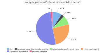 Naše kolegyně René Kalašová nám jednoho dne řekla: "Potřebuju do bakalářky průzkum vnímání značky a chci ho realizovat v Performii. Pomůžete mi?" Odpověď našich holek v marketingu byla jednohlasně pozitivní. A tak vám tu teď můžeme ukázat zlomek z toho, co jsme o Performii zjistili od více než stovky našich klientů z řad šéfů a personalistů zejména malých a středně velkých českých firem. René práci obhájila a dokončila školu a my máme radost z toho, jak dopadly výsledky průzkumu. Pokud by se vám zdálo, že jsou až příliš pozitivní, můžeme na to říct jen jedno: Zavolejte nám a ověřte si je na vlastní kůži!