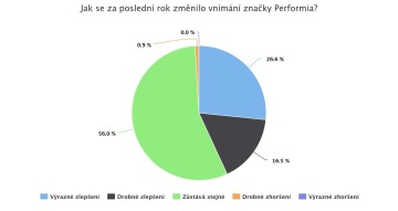 Protože šlo o průzkum vnímání značky, samozřejmě nás zajímalo, jak se u našich klientů za poslední rok změnilo vnímání značky Performia. 27 % uvedlo, že jde o výrazné zlepšení, 16,5 % pak psalo o drobném zlepšení a zbytek to vidí stejně.