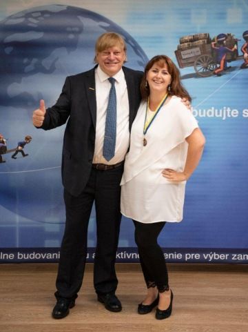 Iva se zakladatelem Performia International Martenem Runowem při přebírání bronzové mezinárodní medaile za největší počet dodaných služeb roku