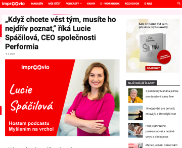 9.3.2022 „Běžnou praxí ve firmách bývá, že se někdo stane manažerem nebo lídrem týmu, protože byl nejlepší v tom, co dělal. Někdo byl například nejlepší servisní technik nebo skladník a za odměnu byl povýšen. Manažerské dovednosti těchto pracovníků bývají potom často postaveny jen na nějakém selském rozumu nebo firemních procesech. Firmy už dnes ale vědí, že to nestačí a že je potřeba své nejlepší lidi dále vzdělávat,” zmiňuje v dnešním rozhovoru pro podcast Myšlením na Vrchol Lucie Spáčilová, výkonná ředitelka společnosti Performia.