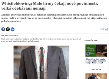 14.11.2023 Zatímco pro velké podniky platí zákonná ochrana oznamovatelů protiprávního chování již od srpna, malé a střední firmy se na povinnosti vyplývající z nového zákona mají čas připravit až do poloviny prosince.